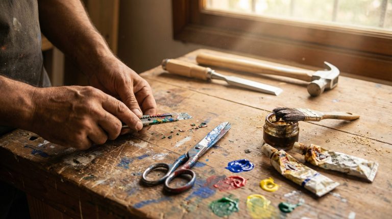 A organização não é apenas estética, é funcional. Separar “entulhos” de materiais úteis é uma prática profissional. Curiosamente, essa disciplina é exigida até em editais públicos; documentos como o da prefeitura de Barra do Corda listam a tarefa de “retirar entulhos e organizar ferramentas” como função essencial de assistentes operacionais. No ateliê, isso significa limpar pincéis imediatamente após o uso e manter tampas fechadas para evitar a secagem dos químicos.