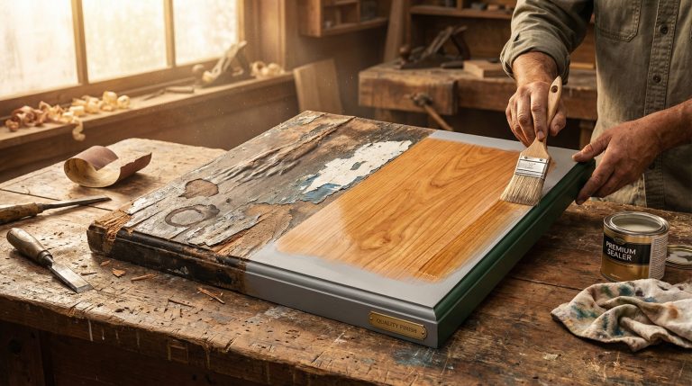 O MDF é como uma “esponja”; se você aplicar a tinta colorida diretamente, ele absorverá grande parte do material, resultando em manchas e desperdício. Por isso, a aplicação de um fundo preparador, goma laca indiana ou incolor é essencial. A goma laca, além de selar, cria uma barreira que protege a peça contra a umidade e evita que a tinta seja absorvida excessivamente. Em madeiras com nós, a selagem também impede que a resina natural da madeira manche a pintura clara com o tempo.