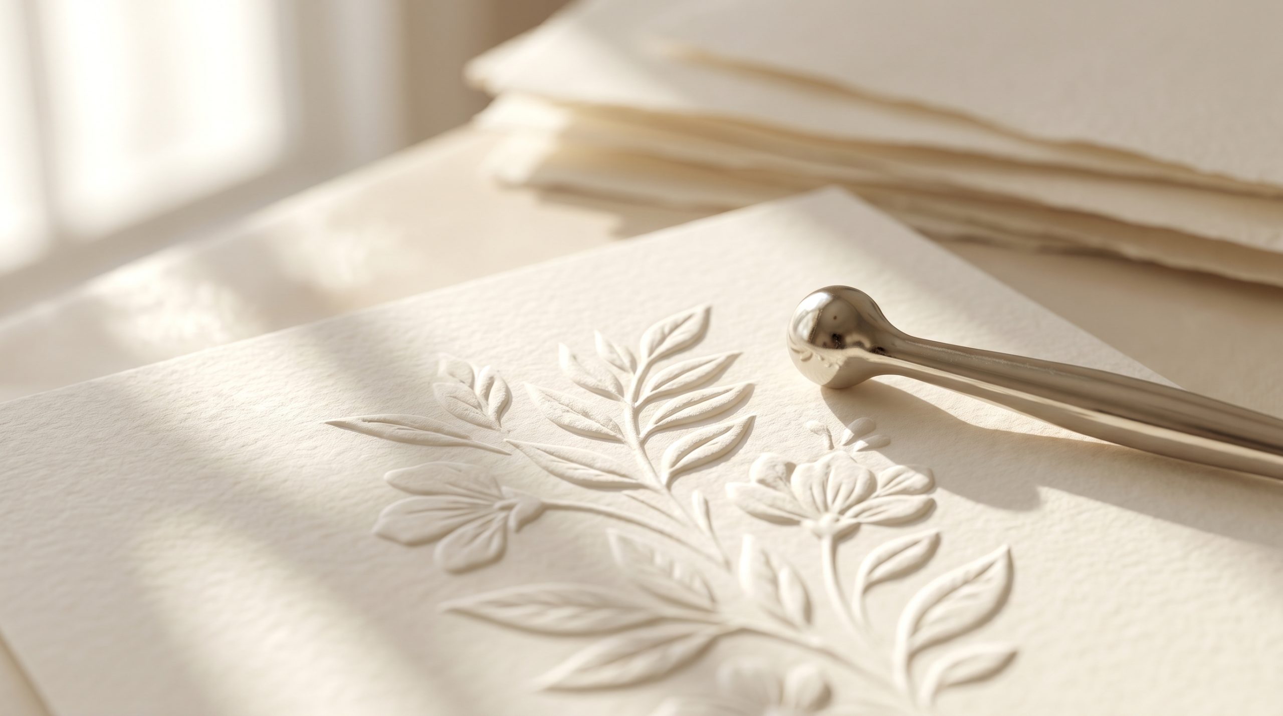 - Molduras e barrados: Aplique o relevo seco apenas ao longo das bordas do cartão, deixando um grande espaço central totalmente liso e limpo para receber a caligrafia ou o carimbo da mensagem principal.