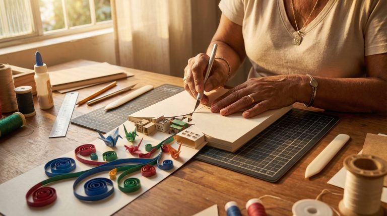 Para trabalhar com precisão, tesouras escolares não são suficientes. Um estilete de precisão (tipo bisturi) é essencial para recortes internos e detalhes minuciosos. Além disso, uma base de corte (cutting mat) é indispensável para proteger sua mesa e prolongar a vida útil da lâmina. Outra ferramenta que muda o jogo é a dobradeira (de osso ou plástico), utilizada para marcar vincos firmes sem danificar as fibras do papel, garantindo que as dobras fiquem nítidas e profissionais.
