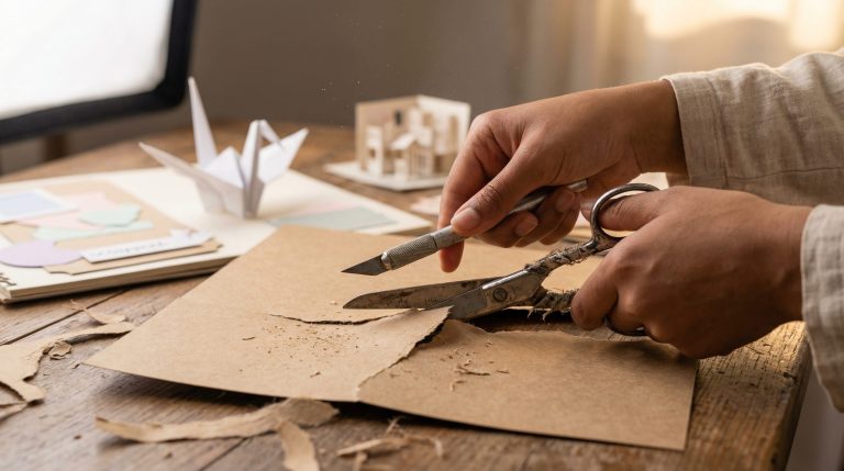 Para dobras, nunca dobre o papel “a olho”. Utilize uma dobradeira (ferramenta de osso ou plástico) e uma régua para marcar o vinco antes de dobrar. Isso rompe levemente as fibras do papel na linha desejada, garantindo que a dobra seja reta e que o papel não rasgue irregularmente na lombada, conferindo um aspecto industrial e limpo à sua criação.