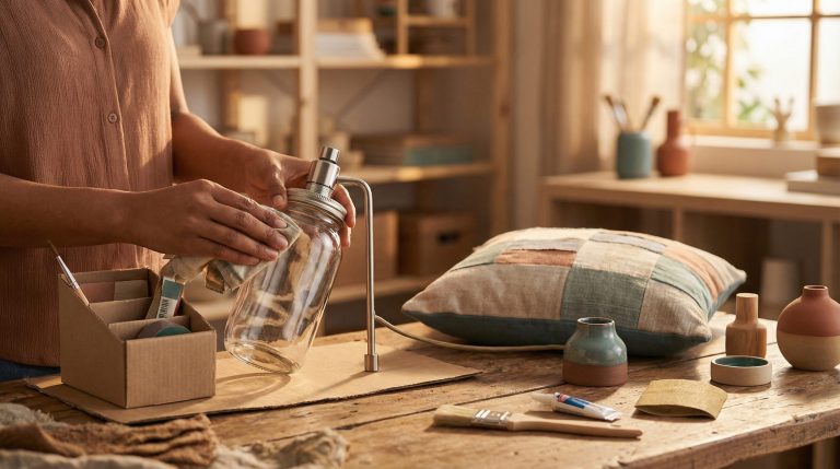 Além da remoção física da sujeira, é crucial desengordurar a peça completamente. O uso de álcool 70% ou vinagre branco antes da aplicação de qualquer primer ou tinta garante que a aderência seja perfeita. Em materiais porosos como madeira de demolição ou papelão reutilizado, a limpeza deve ser feita a seco ou com pano levemente úmido para evitar mofo ou deformações. Preparar a base corretamente é o segredo para que sua peça reciclada não pareça “lixo disfarçado”, mas sim um objeto novo e sofisticado.